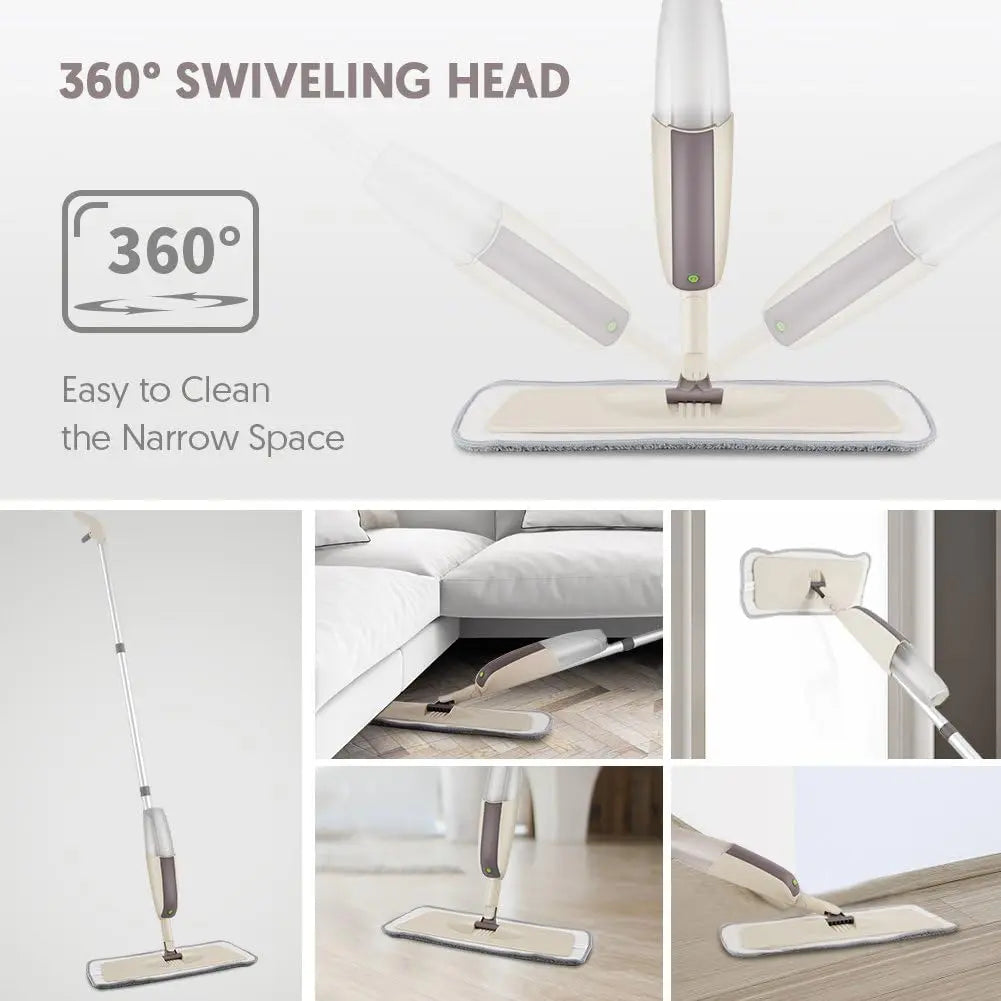 - [MOP SPRAY WITH 360°ROTARY MOP HEAD] - 360°rotary mop head of the hard floor spray mop easily reach into the dark corners of sofas, bottoms, etc, do not need to bend over, bid farewell to mobile furniture. Our flat mop with spray can clean with simple water, or add any cleaning solution. Design your own cleaning plans.